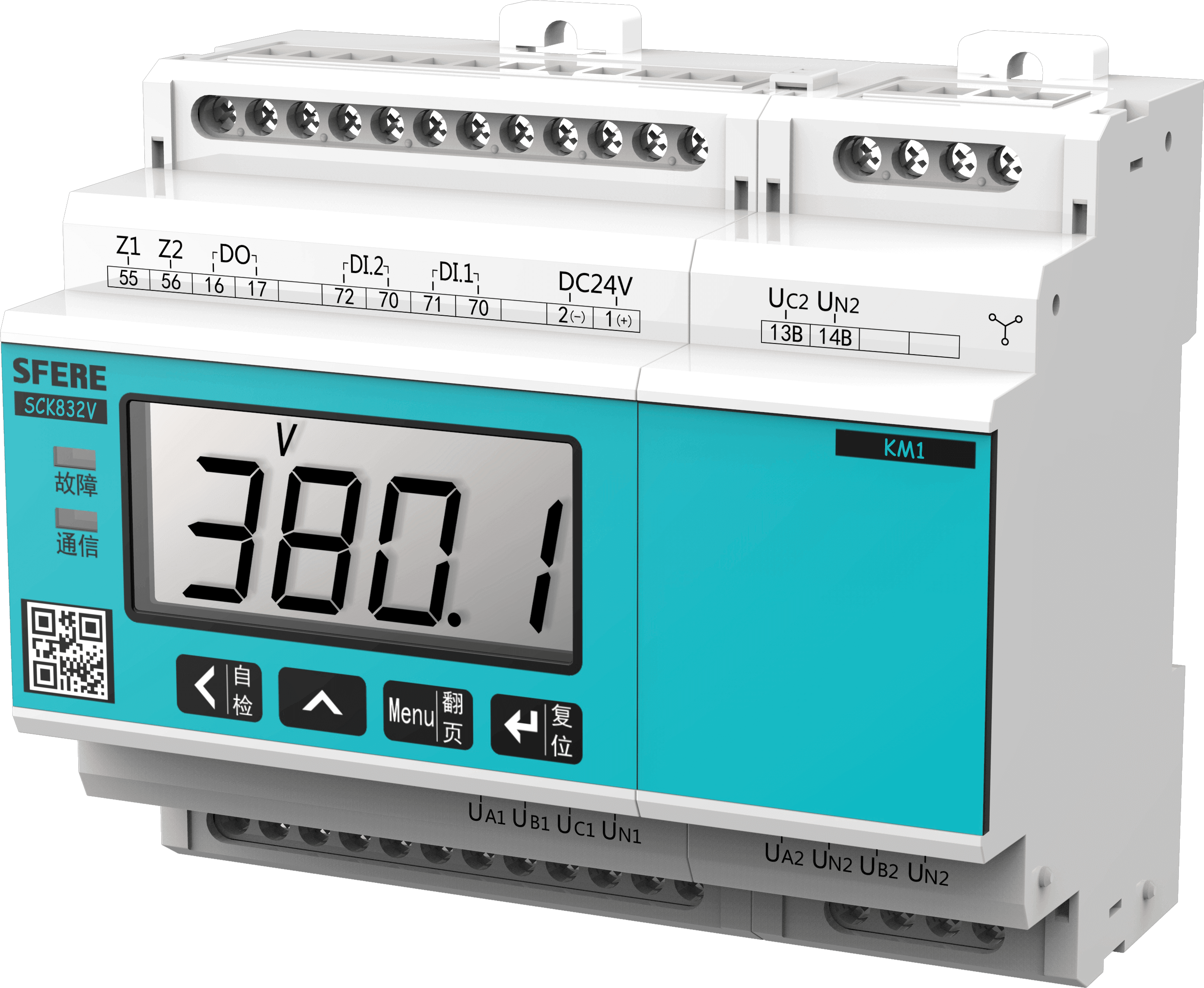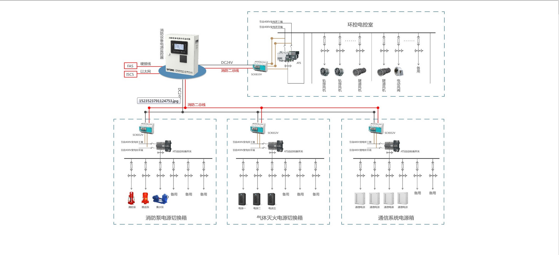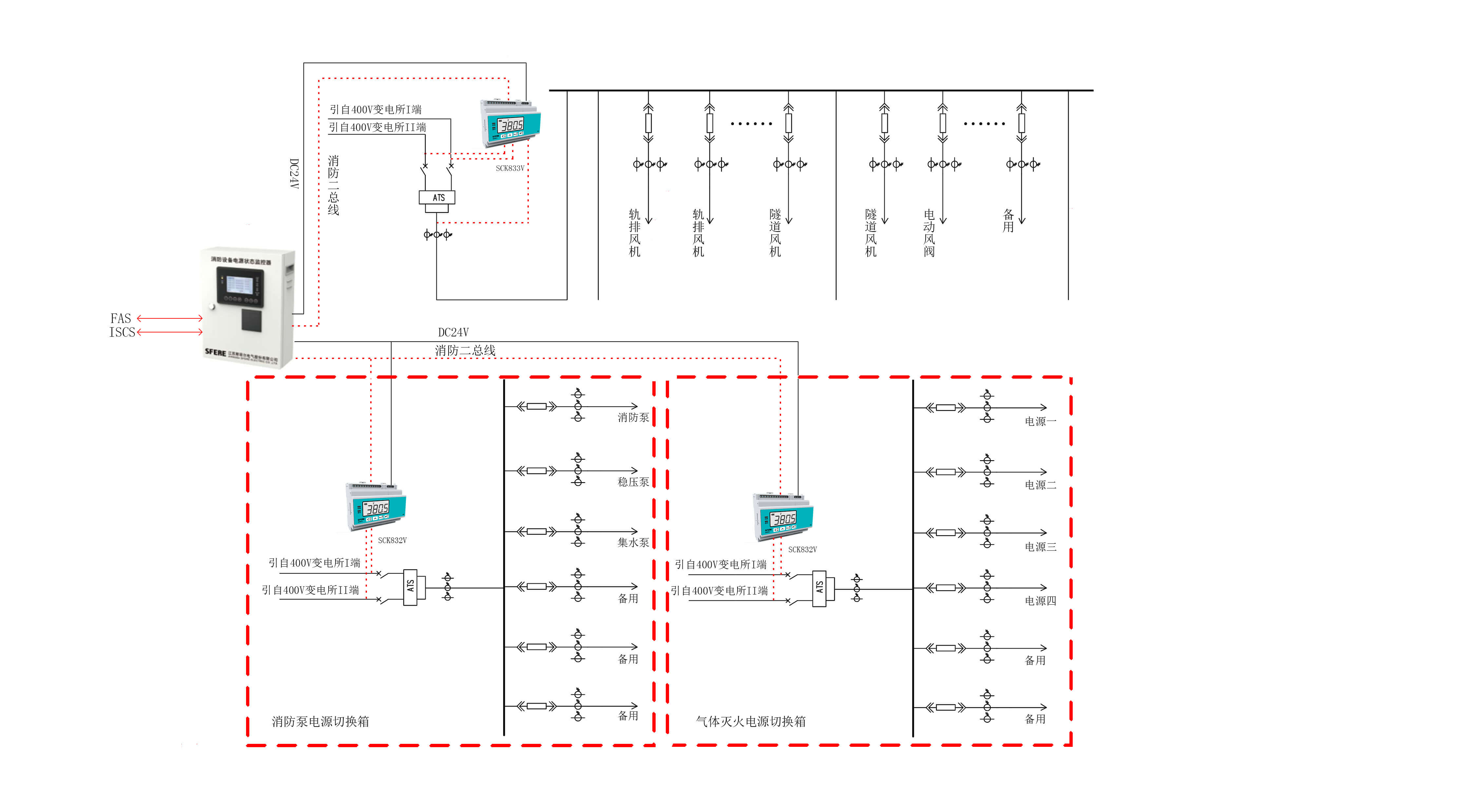 在環(huán)控配電室進(jìn)線柜安裝一只SCK833V電壓傳感器,同時(shí)監(jiān)測(cè)ATS進(jìn)線(主/備)及出線共計(jì)3路電壓,柜內(nèi)傳感器經(jīng)消防二總線連接至監(jiān)控主機(jī)下行通信口。在消防負(fù)荷、通信、信號(hào)等重要負(fù)荷配電箱內(nèi)安裝SCK832V電壓信號(hào)傳感器,同時(shí)監(jiān)測(cè)ATS進(jìn)線(主/備)電壓,經(jīng)消防二總線連接至監(jiān)控主機(jī);傳感器工作所需DC24V電源由監(jiān)控主機(jī)提供,確保傳感器在市電斷電的情況下正常工作。
