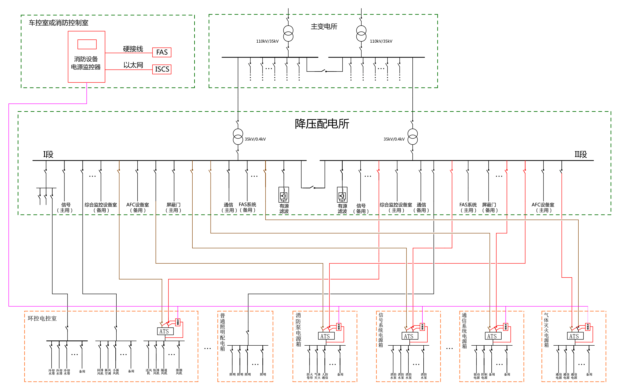 GB25506-2010《消防控制室通用技術(shù)要求》作出了“消防控制室應(yīng)能顯示系統(tǒng)內(nèi)各消防用電設(shè)備的供電電源和備用電源的工作狀態(tài)和故障報(bào)警信息”的強(qiáng)制性規(guī)定,GB50116-2013《火災(zāi)自動(dòng)報(bào)警系統(tǒng)設(shè)計(jì)規(guī)范》也對(duì)消防控制室內(nèi)要設(shè)置消防電源監(jiān)控器提出了明確要求。因而,通常在地鐵設(shè)計(jì)和建設(shè)時(shí)會(huì)設(shè)置消防設(shè)備電源監(jiān)控系統(tǒng)。